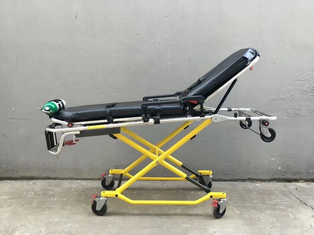 MDKのクロス型アルミニウム合金救急ストレッチャー(モデルMDK-D14)は、黄色のスプレー塗装が施されたアルミニウム合金製で、8cmスポンジのPVCマットレスが特徴です。頭部(65°)、背もたれ(最大75°)、膝(35°)の角度調整が可能で、リバーシブルポリマーガードレール、Ø150mmゴム車輪、酸素ボンベラック、ベストスタイルのストラップを備えています。